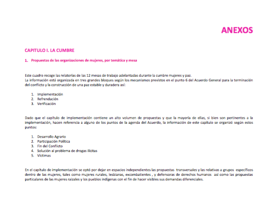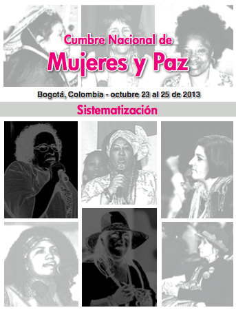 La presente sistematización tiene como propósito hacer accesible toda la información producida en la Cumbre Nacional de Mujeres y Paz celebrada entre el 23 y 25 de octubre de 2013